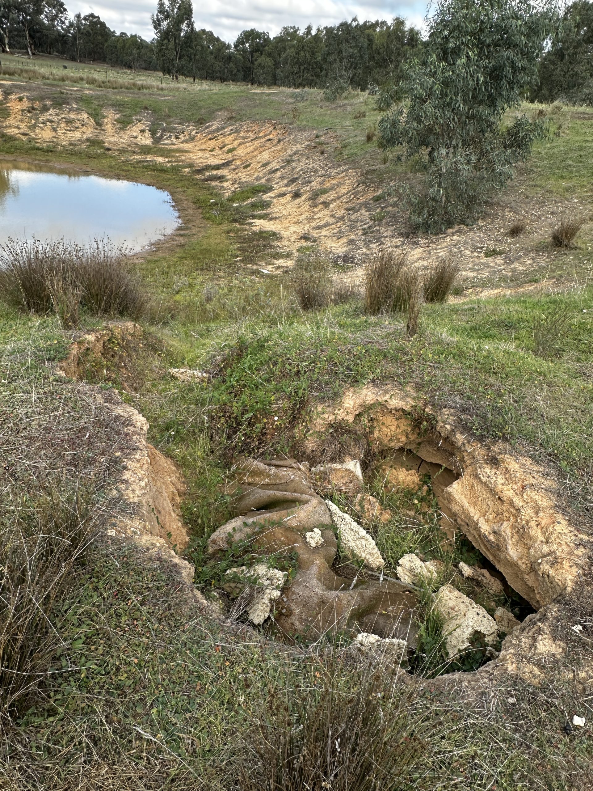 We also have issues once the water does reach the lower paddocks in that it tends to run off the bare ground where the gate sits, as this is the steepest point, where it then collects in what appears to be an old overflow channel of Axe Creek. This is where our dam sits, but rather than run through the old soak as once would have happened, the previous owners have channelized the water so that it is directed into a small section and enters the dam in one thin stream. This has resulted in a severely eroded gully that has collapsed part of the dam’s edge. Every time it rains now, the erosion gets worse and the gully gets deeper.