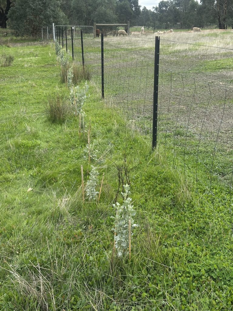 Atriplex nummularia planted along an internal fence line. The sheep do not currently have access to this part of the property.As the plants grow and spread through the fence into the main paddock, they will provide valuable fodder in dry times.